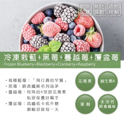 ✅ 農殘檢驗合格 ✔️ 每包擷取三種莓果高纖的特性,順暢迎接每一天! ✔️ 3種冷凍莓果組合,各佔33~34% ✔️ 可加入其他水果,優格等製成冰沙 ✔️ 小資份量無負擔!