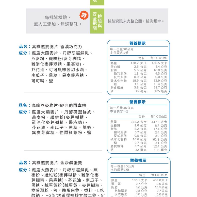 嚴選大燕麥片、丹醇研選鮮乳、燕麥粉、纖維粉(麥芽糊精、難消化麥芽糊精、果寡糖)、芥花油、南瓜子、黑糖、鹹蛋黃粉【鹹蛋黃、麥芽糊精、樹薯澱粉、鹽、酪蛋白鈉、香料、L-麩酸鈉、I+G(5′-次黃嘌呤核苷磷酸二鈉、5′-鳥嘌呤核苷磷酸二鈉)、混合濃縮生育醇(抗氧化劑)】、異麥芽寡糖、糖、鹽