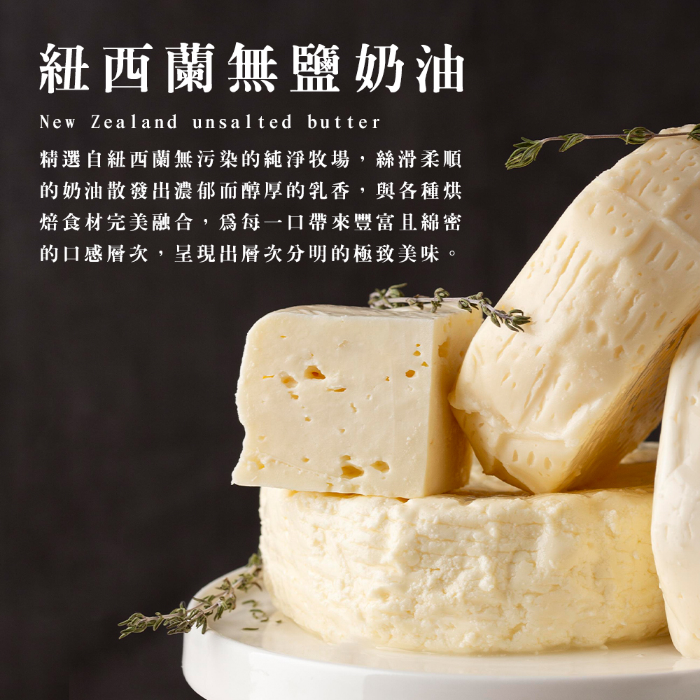 嚴選日本麵粉 質地細緻 麥香風味紐西蘭無鹽奶油 濃郁醇厚乳香口感層次分明 鬆軟富有彈性