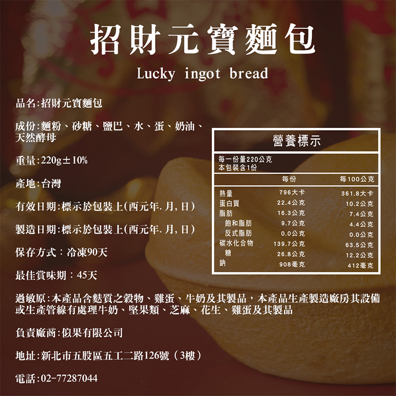 過敏原:本產品含麩質之穀物、雞蛋、牛奶及其製品,本產品生產製造廠房其設備或生產管線有處理牛奶、堅果類、芝麻、花生、雞蛋及其製品