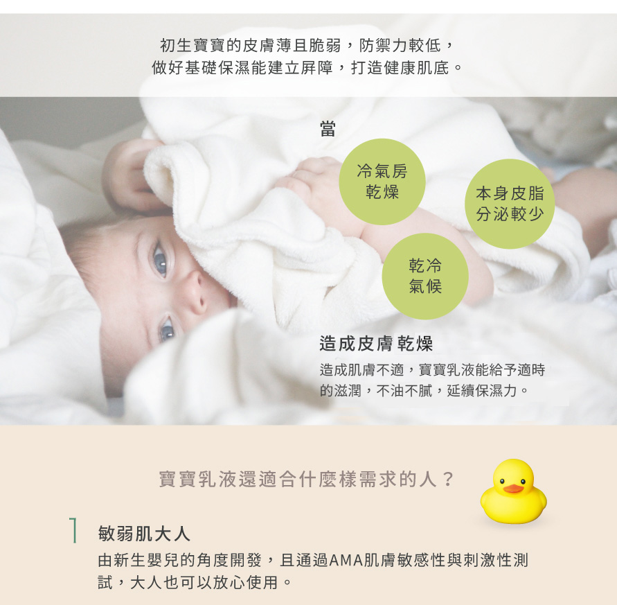 100%天然來源成份,無香料、無色素,全家都適用的保濕身體乳通過美國AMA肌膚敏感性與刺激性測試,0歲寶寶/敏弱肌可安心使用添加有機橄欖、荷荷芭、乳木果油,鎖住肌膚水分,強化天然屏障植萃來源保濕配方,鎮定舒緩、長效滋潤,緩解寶寶肌膚乾燥、紅癢脫屑COSMOS有機驗證/容量:200ml