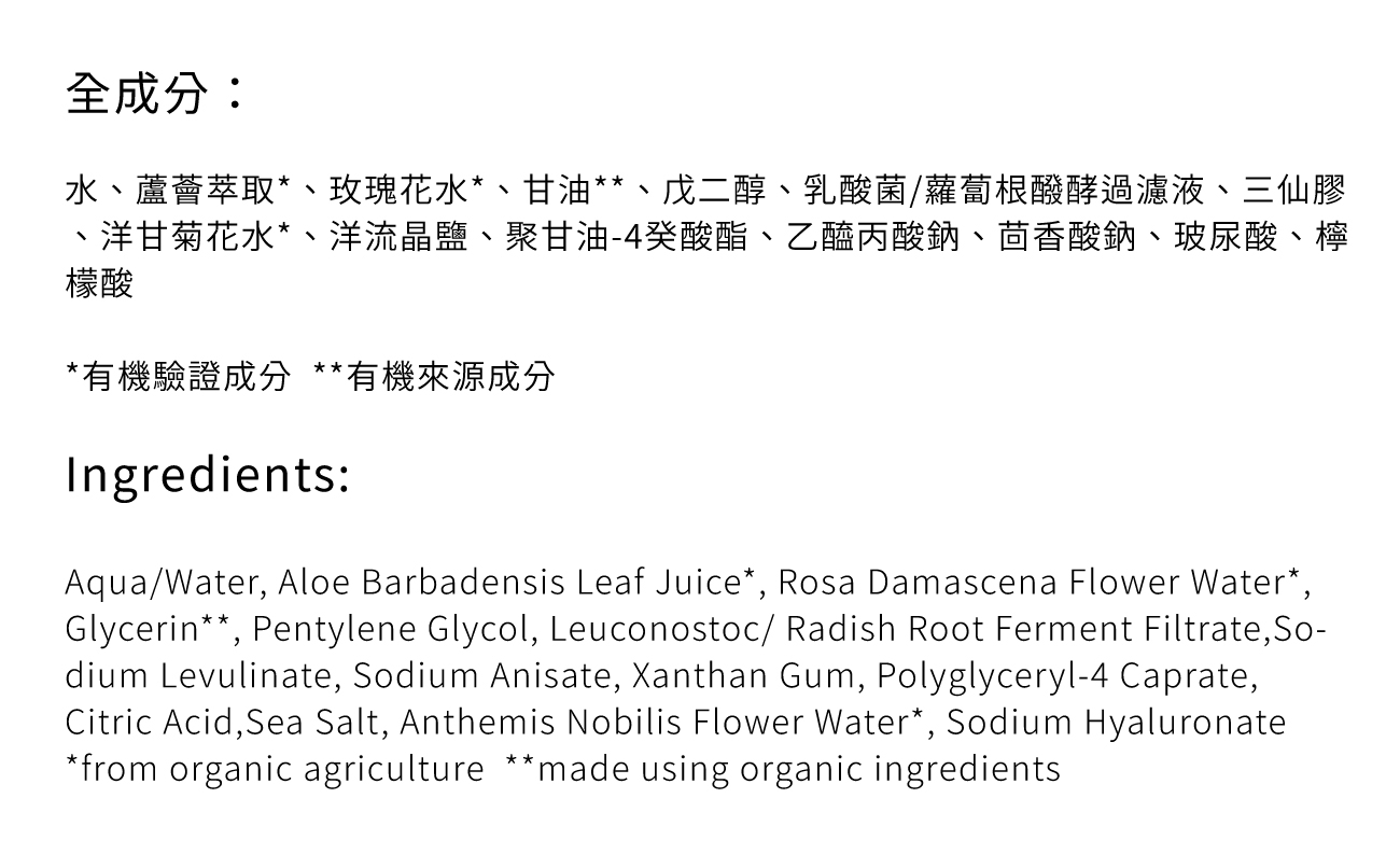 100%天然來源成份,不含酒精、香精,敏弱肌安心敷 15分鐘快速滲透角質層,深度補水,清爽不黏膩 蘿蔔根x海洋晶鹽,平衡肌膚生態、恢復水潤光澤 市面首款能被自然分解的,100%有機棉面膜布 【榮獲NEXTY美國天然產品競賽大奬】 【入圍2025天然健康美容獎】 COSMOS有機驗證/容量:115ml
