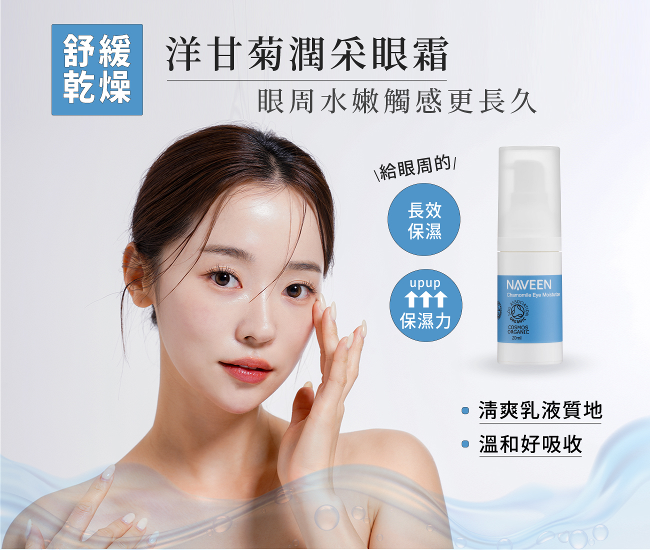 有機洋甘菊及有機蘆薈萃取,強力補水,滋養眼周肌膚