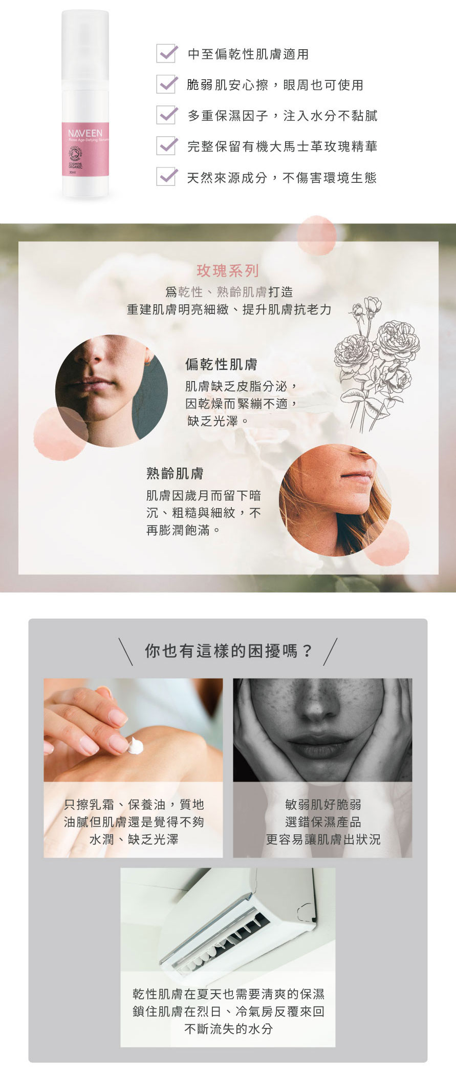 抗老保濕首選,添加有機奧圖玫瑰精華,緊緻肌膚 有機植萃為基底,重現肌膚彈潤光澤,乾肌、輕熟齡推薦! 100%天然來源成份,水感精華質地,讓肌膚喝飽水 高純度玻尿酸x多重補水因子,快速滲透肌底,延長肌膚保濕力 珍貴藻類與千日菊萃取,延緩老化、預防細紋 COSMOS有機驗證/容量:30m
