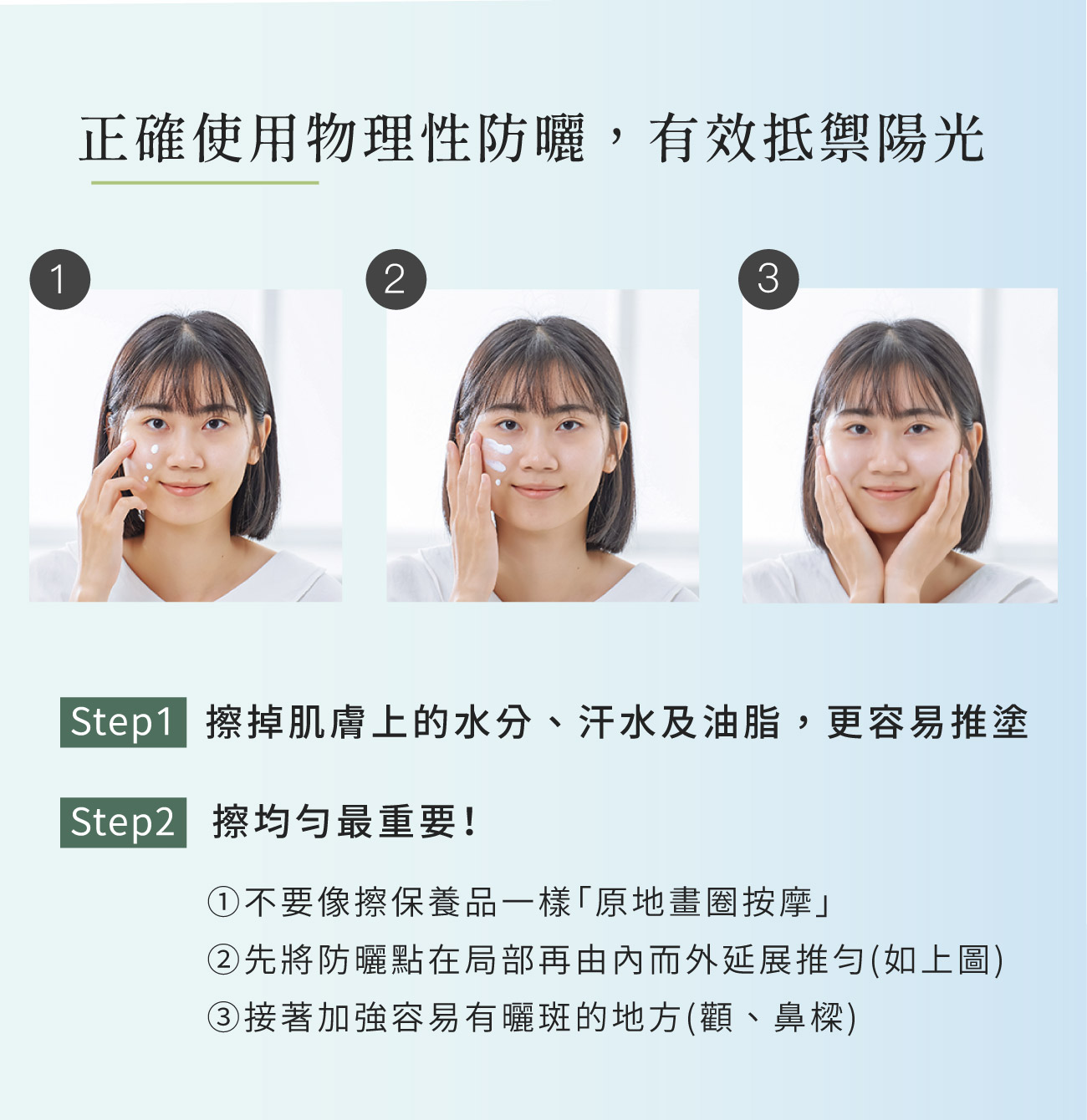 質地輕透好推開,適合擦在臉部及全身,清爽不黏膩 一抹形成防曬保護層,快速貼合肌膚,自然提亮不死白 不需卸妝,一般清潔用品即可洗淨