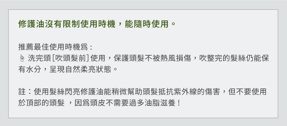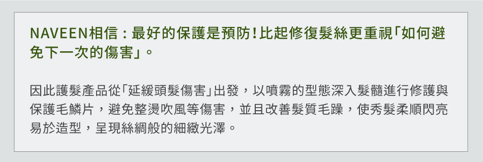 日常吹整、造型前用,一噴即保濕、無需沖洗,預防頭髮乾澀毛躁