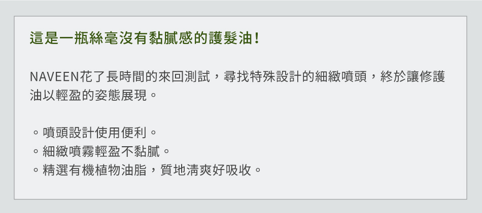 特殊噴頭設計,均勻包覆髮絲,跟化妝水一樣清爽好吸收!