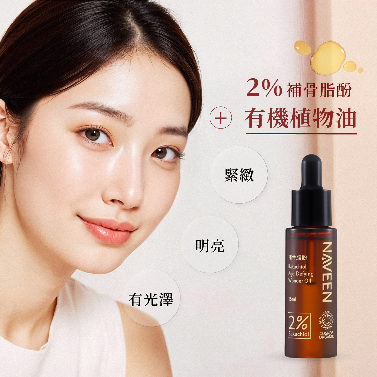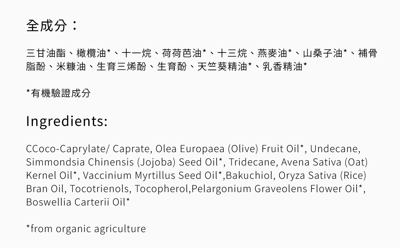 質地滋潤好吸收,適合乾肌、熟齡肌、不耐A醇者 專注進階抗老與保濕配方,,全方位緊緻、明亮、有光澤 添加2%植物萃取「補骨脂酚」,有植物界A醇之稱,溫和抗老 含高比例有機植物油,加強保濕潤澤、淡化乾燥細紋 調理肌膚、淡化暗沉困擾,為肌膚注入水光、恢復飽滿 可早晚使用,日夜持續抗老修復 【榮獲歐洲最佳有機美容新品獎】 【榮獲2025天然健康美容獎 銀獎】 15ml / 100%天然來源成分 / COSMOS有機驗證
