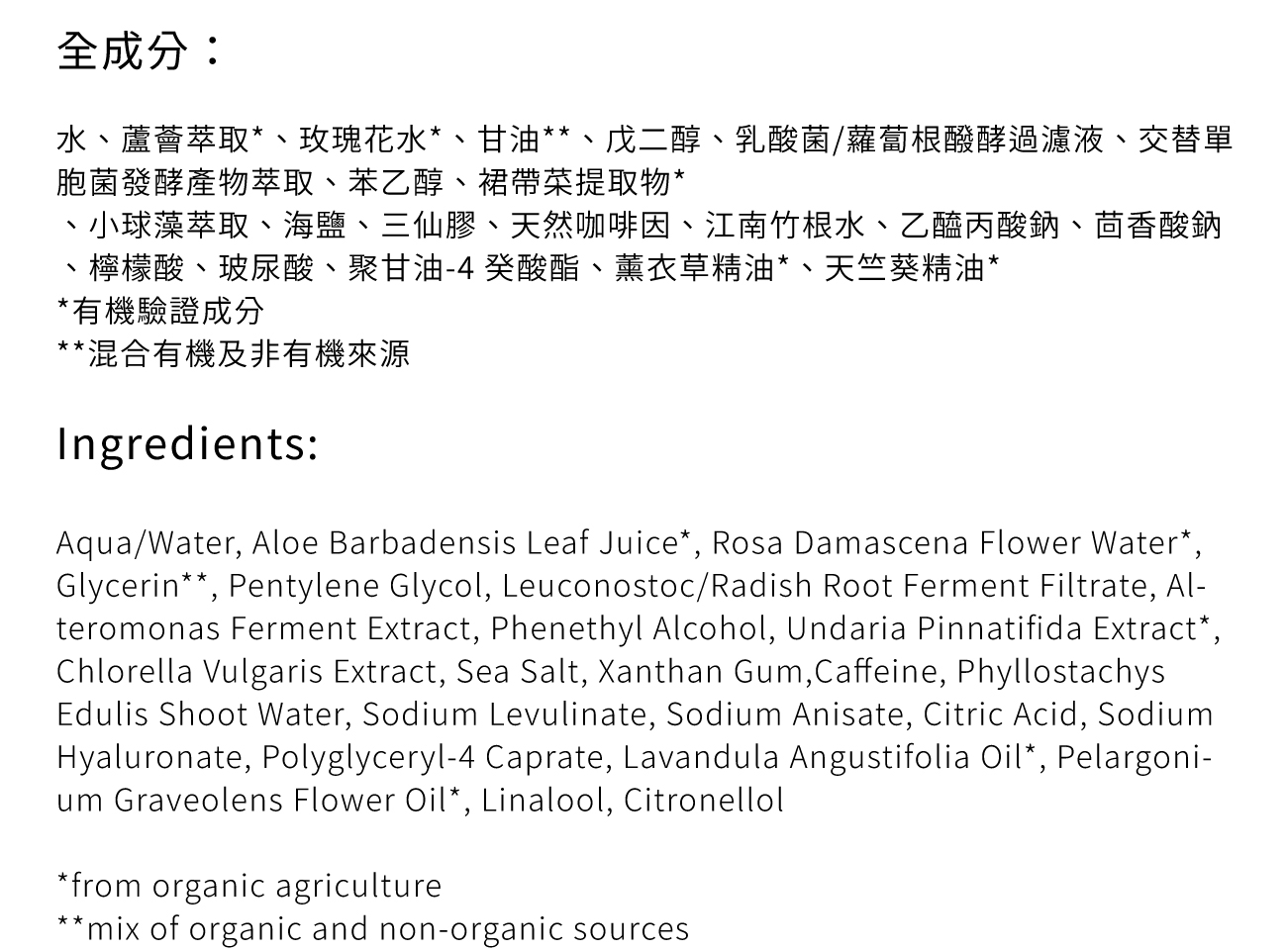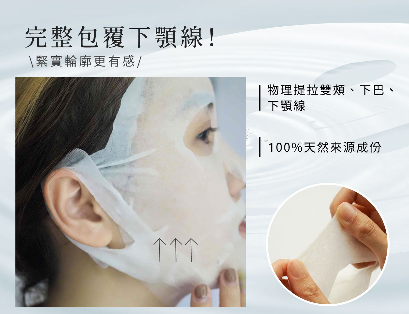 100%天然來源成份,不含酒精、香精,敏弱肌安心敷 親膚補水不黏膩,恢復肌膚彈性 珍貴藻類萃取x玻尿酸x咖啡因, 水腫急救必備,進階抗老撫紋 耳掛式設計完整包覆臉型,加強拉提下顎線條,打造精緻V型臉 市面首款能被自然分解的,100%有機棉面膜布 COSMOS有機驗證/容量:26ml