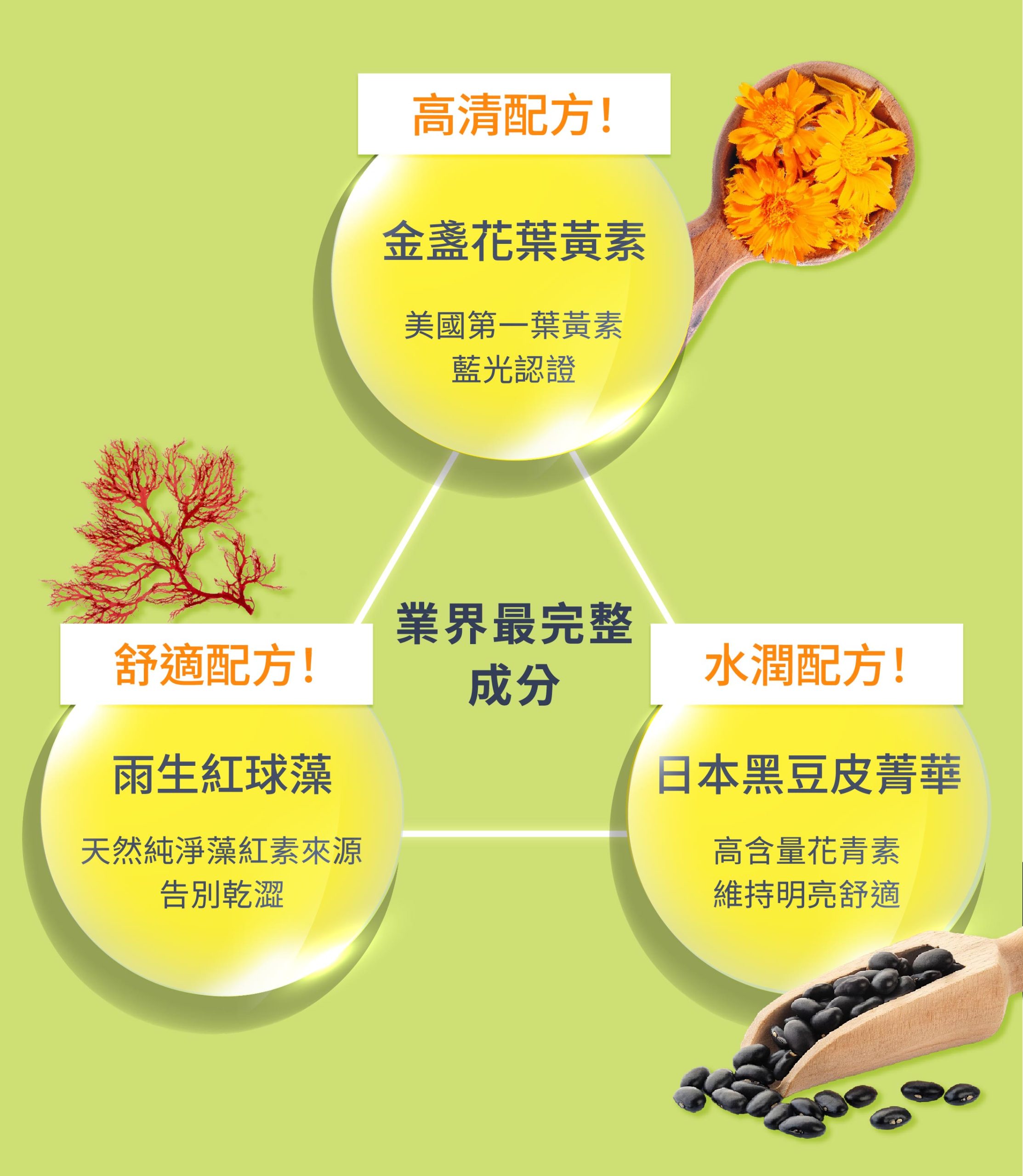 一顆含10毫克的葉黃素以及2毫克的玉米黃素,是基於美國大型保健實驗AREDS2發表的最佳比例,所打造的黃金配方